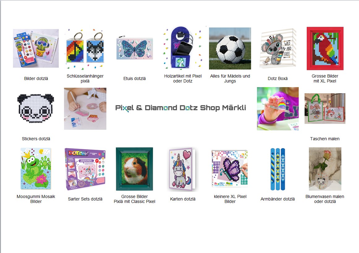 Geh doch mal auf meine Webseite: www.Pixel-shop.ch stöbern. Solltest Du schon was Spezielles finden, was Du unbedingt machen möchtest, kannst Du es mir gerne per WhatsApp 078 707 36 73 mitteilen. Dann nehme ich es am Kurstag für Dich mit. Ich freu mich riesig.